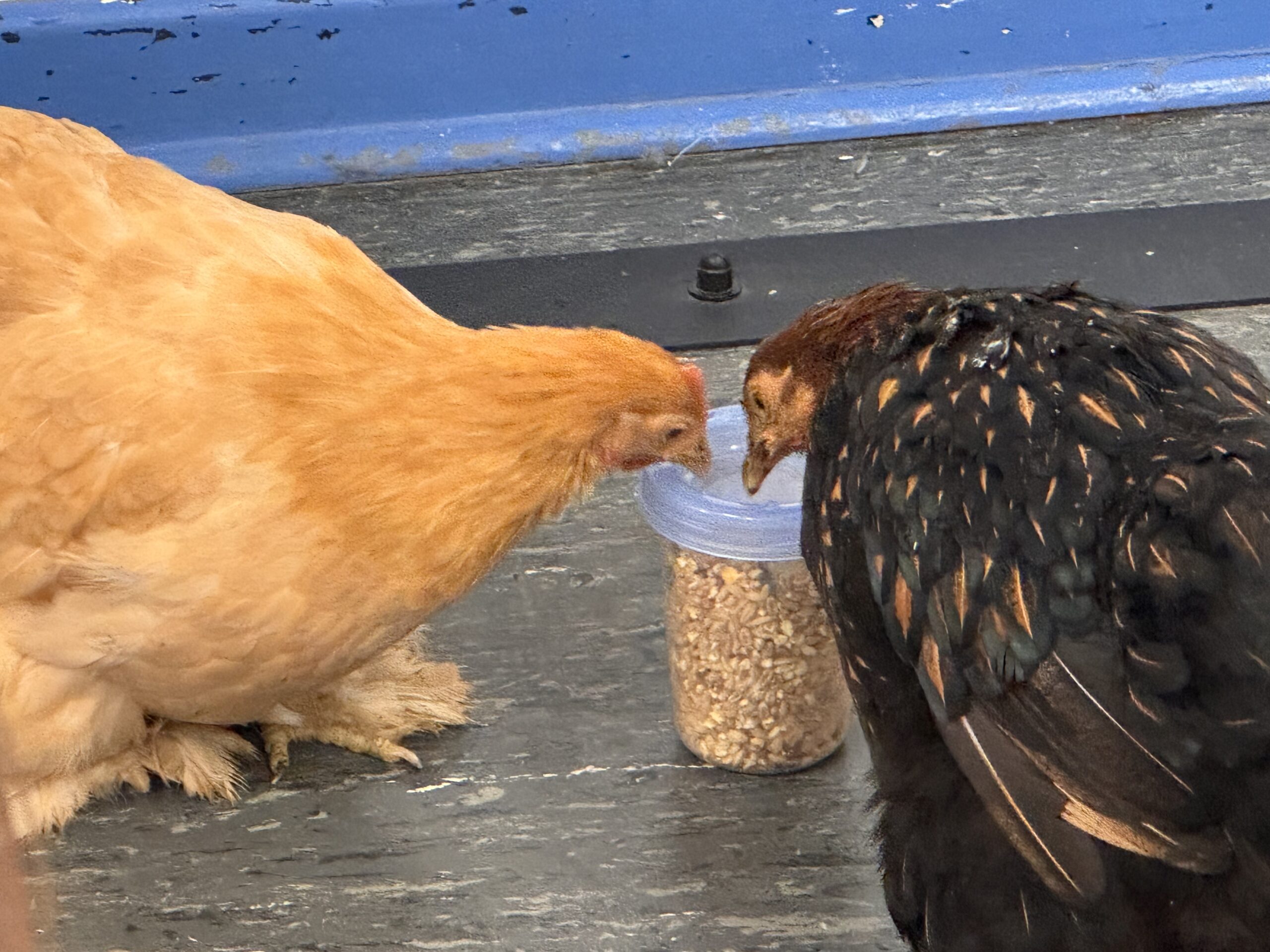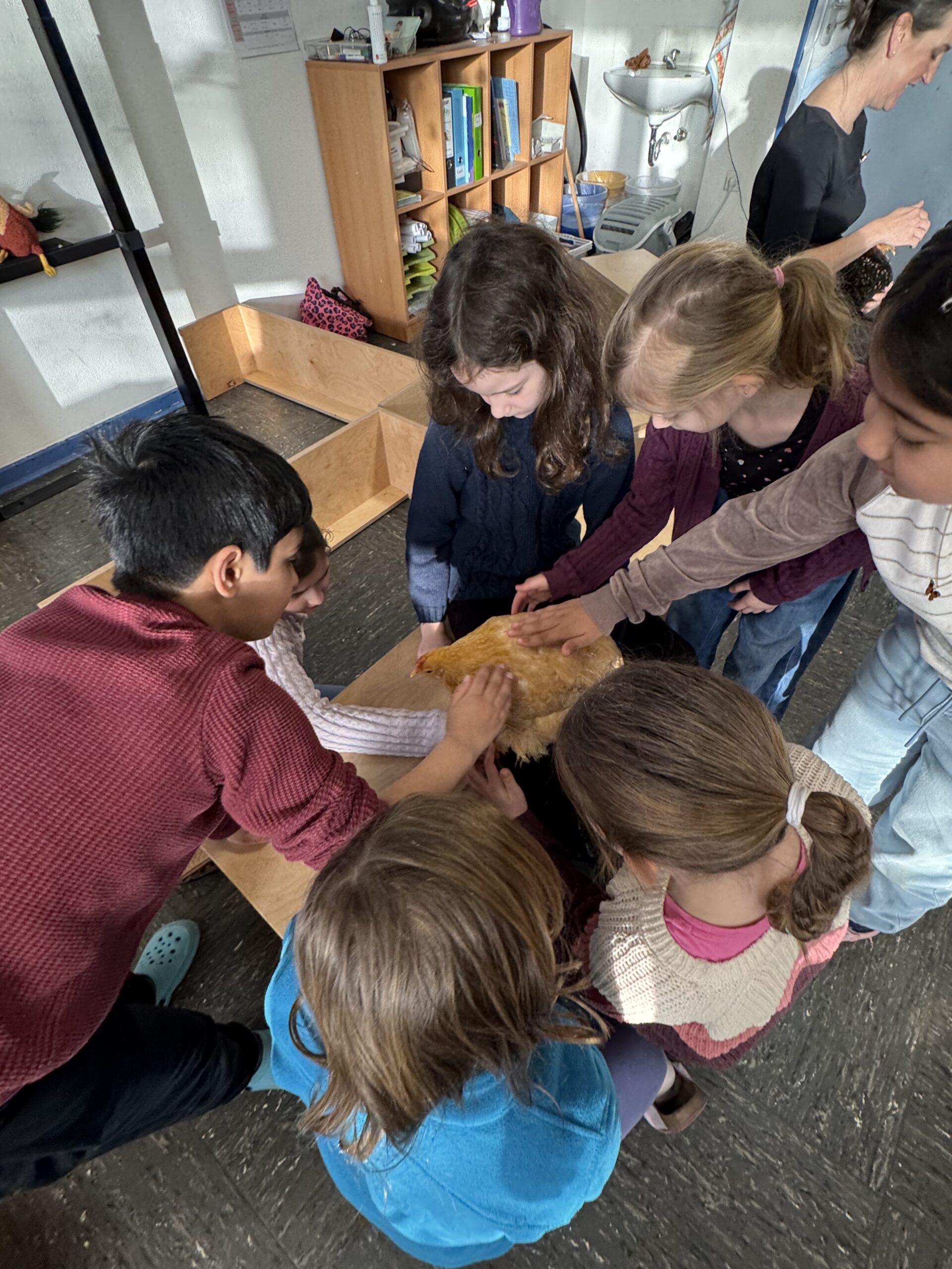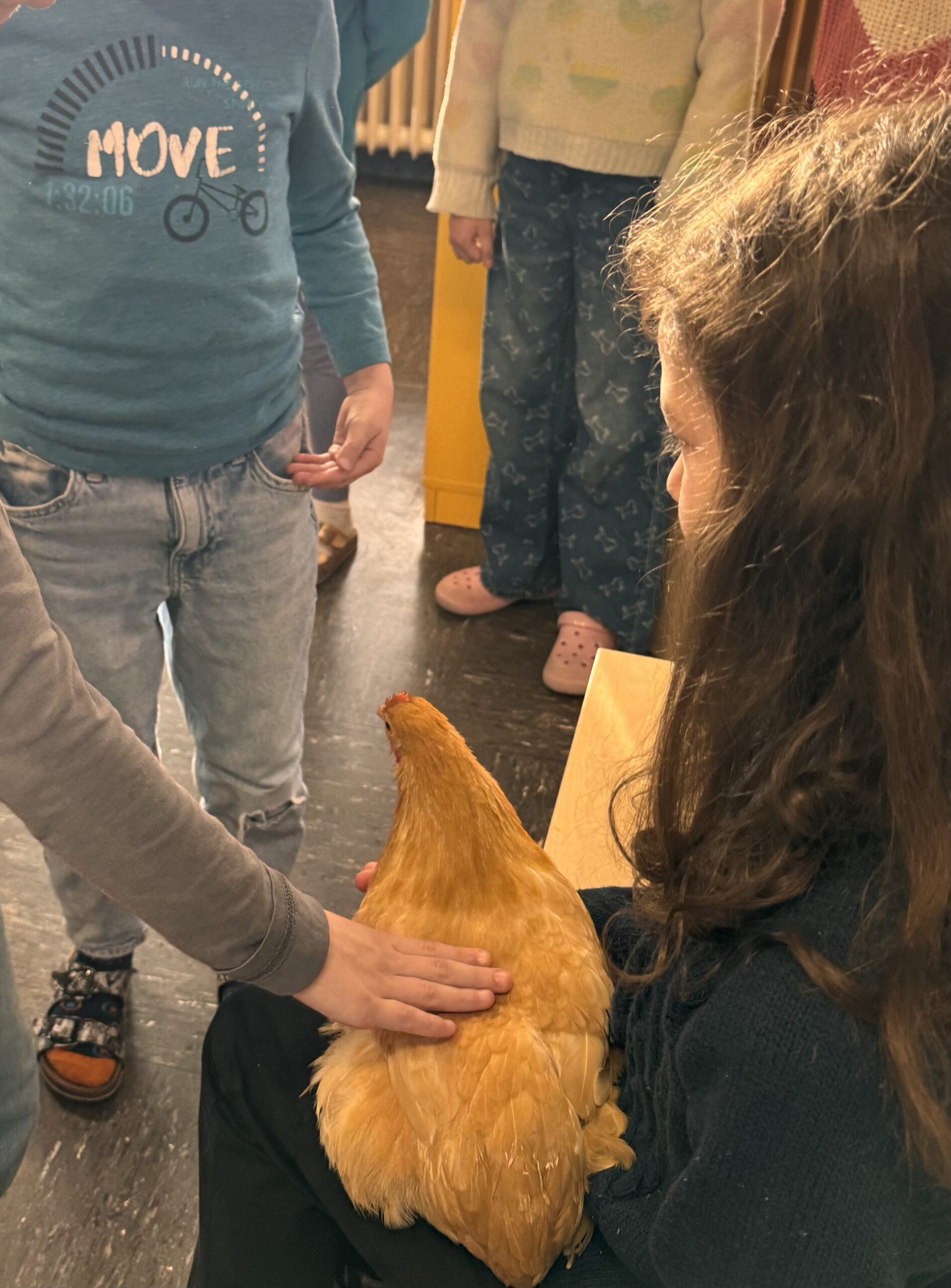 Die beiden Hühner ließen sich mit unendlicher Geduld von jedem Kind streicheln, sodass sich alle ganz persönlich von der Weichheit des Gefieders überzeugen konnten. Pünktlich zum Gong wurden die zwei wieder in ihre Transportbox gesteckt und konnten sich anschließend im heimischen Garten erholen. Sicher hatten sie ihren beiden daheimgebliebenen Hühnerschwestern viel zu erzählen…